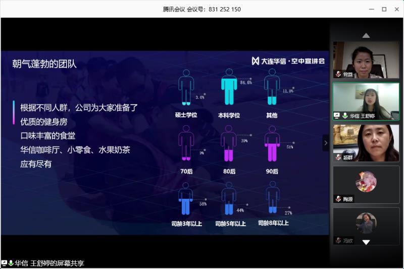 2020年6月11日晚19:30,由于疫情影响,beat365唯一官网特邀请大连华信计算机技术股份有限公司,在腾讯会议平台,为我院日语专业大三的学生召开了“大连华信实习线上宣讲会”。本次宣讲会由大连华信人力资源负责人白璐主持,王舒婷为主讲人,beat365唯一官网副书记王颖群、日语系主任曾妍及全体2017级日语专业学生参加了本次会议。