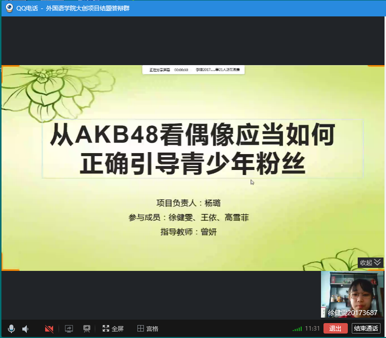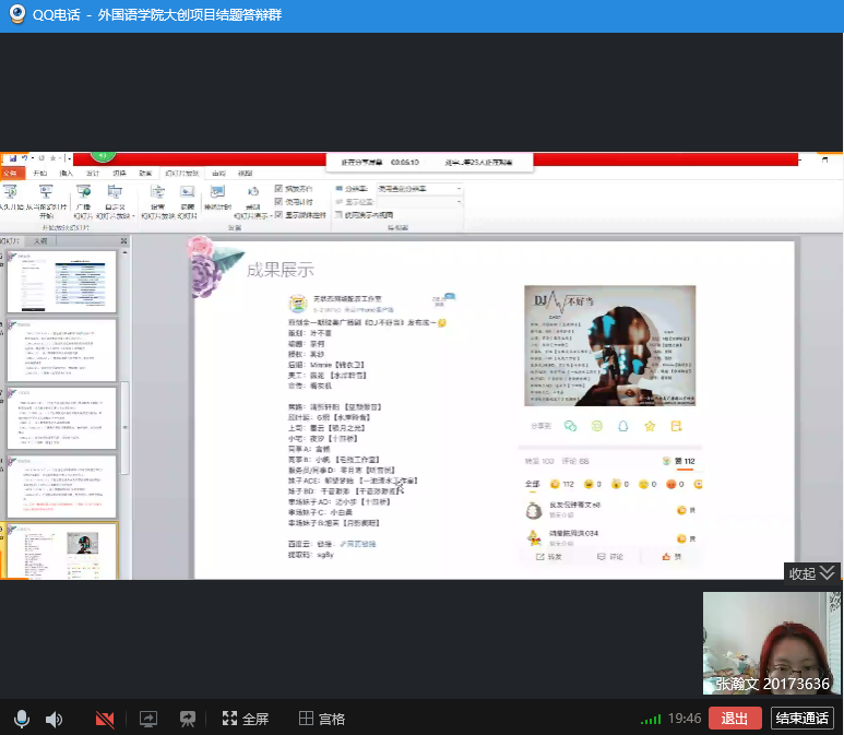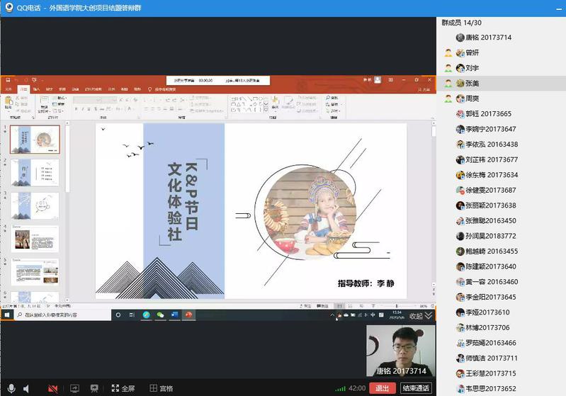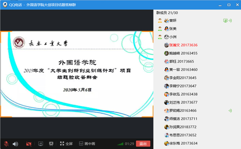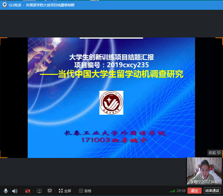 (通讯员:张美)5月6日星期三下午13:00-17:00,beat365唯一官网利用QQ网络平台进行了2019年度“大学生创新创业训练计划”项目结题线上验收评审工作。英语系主任刘宇、日语系主任曾妍、俄语系主任张美担任此次结题验收答辩的专家评委。学院副院长周爽全程参加评审验收。