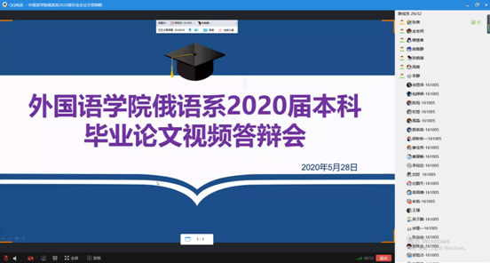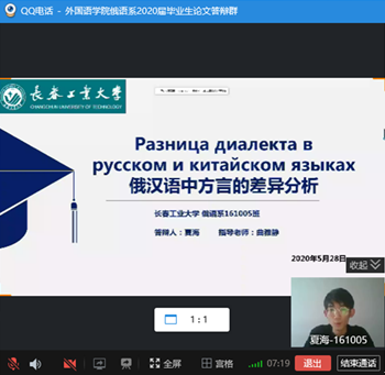 本网讯(通讯员 张美)按照《长春工业大学2020届本科毕业设计(论文)答辩工作方案》以及beat365唯一官网关于2020届本科毕业论文答辩指导文件的要求,在经过三轮查重检测之后,俄语系制定了审核答辩+视频答辩的具体实施办法。毕业论文答辩工作有条不紊地进行,经过评审推荐,王凯、夏海、牟铭、吴子鹏、姜佳秀、郑玉等6名同学参加了视频答辩。俄语系主任张美主持答辩会,并做开场发言,介绍了答辩委员会成员以及整个答辩流程。俄语系教师全部出席答辩会,学院院长彭又新,副院长周爽参加了答辩会。
