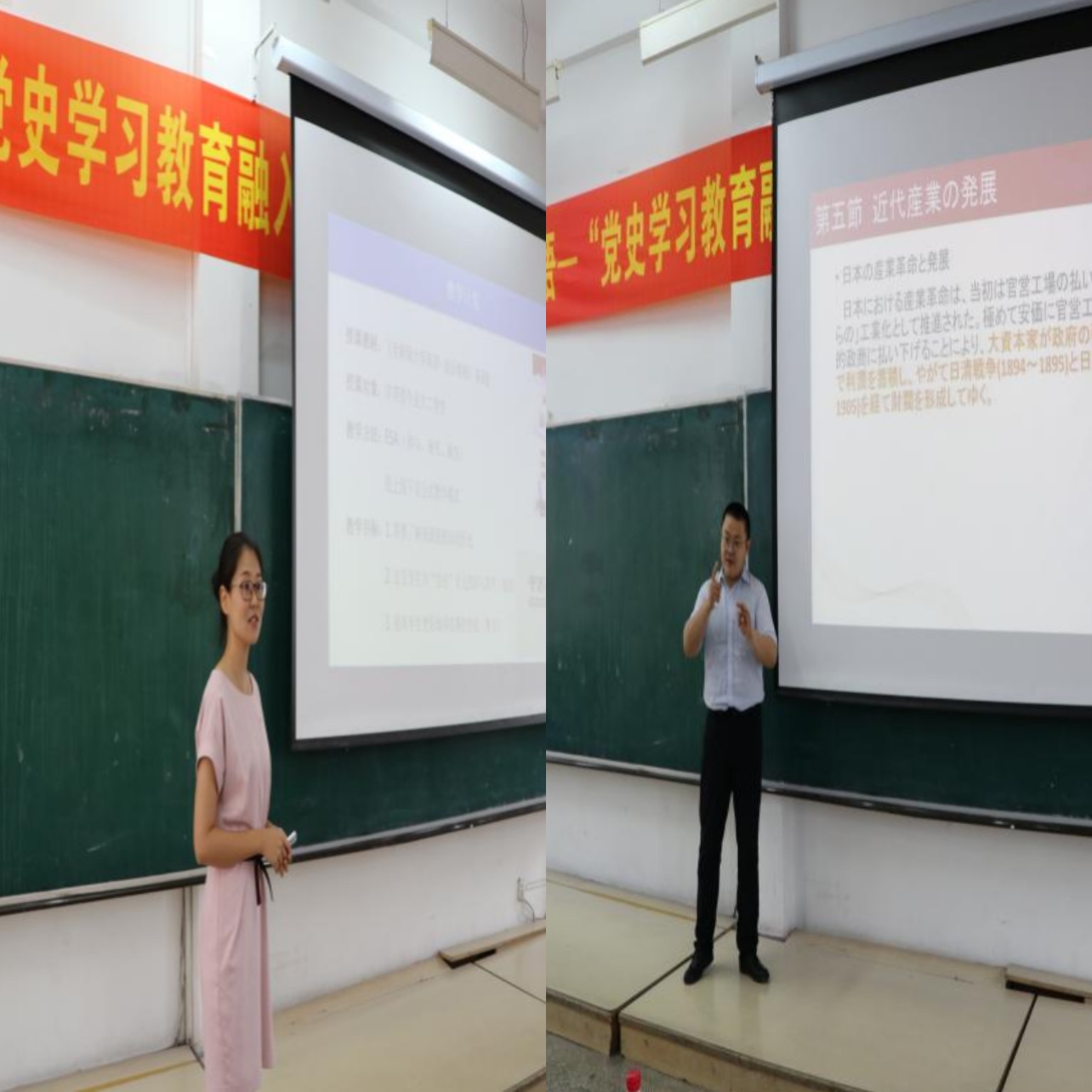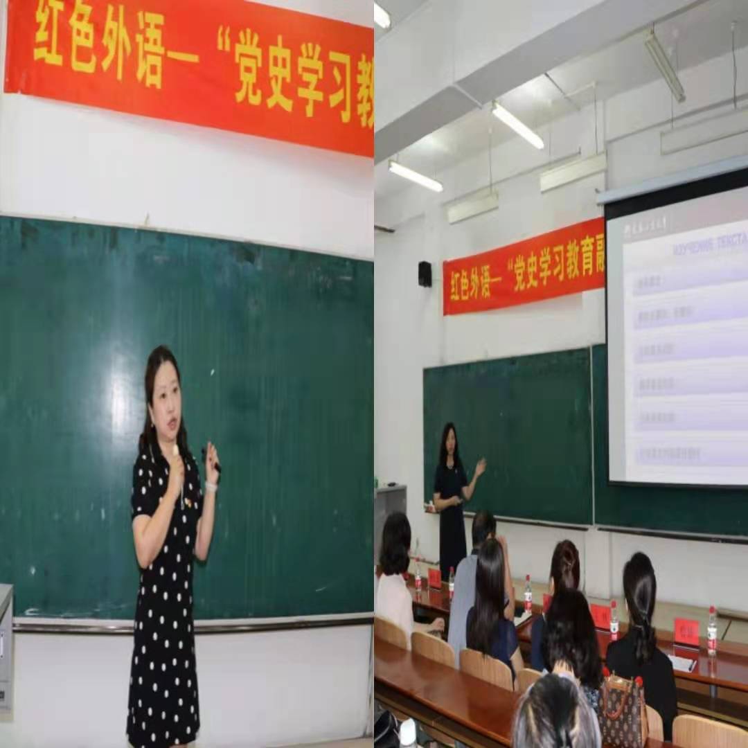 为了上好这堂示范课,学院党委高度重视,从英日俄各专业及公共外语教学部选拔了优秀教学骨干主讲,并就如何将党史学习教育更好融入外语课程教学,进行了认真的备课,组织了预审和研讨,力求为全院教师做好示范。课堂上,来自英语系的赵艳宇老师、俄语系的张晓薇老师、日语系的宋卓时老师、公共外语教学部的赵雪老师,先后就《英语国家社会与文化1》《高级俄语1》《日本概况2》《大学英语》四门课程进行了精彩展示,分别从不同的角度深入挖掘、融入了党史元素,充分体现了“红色外语”的主题,为全院教师在教育教学中不断深化党史学习教育和课程思政建设作出了榜样,得到了与会领导、教师的充分肯定。