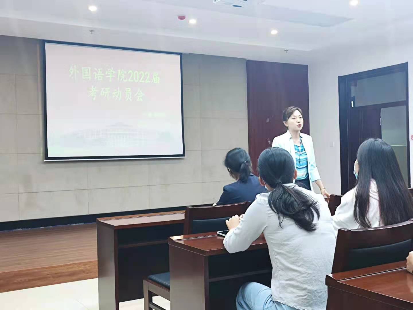 新闻网讯(通讯员 江炜彬)为帮助2022届毕业生解答考研疑惑,明晰考研方向,beat365唯一官网于9月16日中午12:40在北湖校区东区主楼435会议室召开“2022届毕业生考研动员会”。副院长王轶、副院长曾妍、俄语系主任张美、英语系支部书记兼研究生辅导员李笑及全体毕业生参加会议。