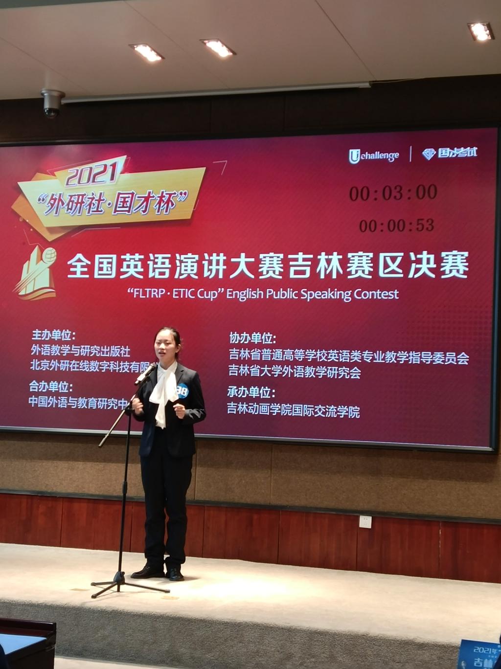新闻网讯(通讯员 孙莉)10月30日,2021年“外研社·国才杯”全国英语演讲大赛吉林赛区决赛在吉林动画学院文化艺术中心隆重举行。经过8个小时的激烈角逐,我院公共外语教学部老师指导的王蕊同学从52名参赛选手中脱颖而出,荣获特等奖,并将与来自东北师范大学、空军航空大学的两名同学代表吉林省前往北京参加全国总决赛。
