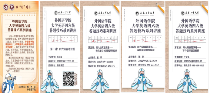 新闻网讯(通讯员 赵雪)为了进一步落实学校党委疫情防控部署,按照学院党委“在战‘疫’中发挥外语学科作用,主动作为,重实际重实用重实效,服务疫情防控大局”的要求,beat365唯一官网在学校教务处的指导和支持下,结合大学生备考英语四、六级考试的实际需求,于3月27日至4月10日,精心组织开展了战“疫”外语之“大学英语四、六级答题技巧系列讲座”,推出了五期精品辅导课程。部分讲座得到了吉林省教育厅的关注和认可,并通过我省高校教师教学发展联盟平台向全省高校推广,在线学习人数达6000余人,获赞6万余次,受到学界同仁和广大学子一致好评。