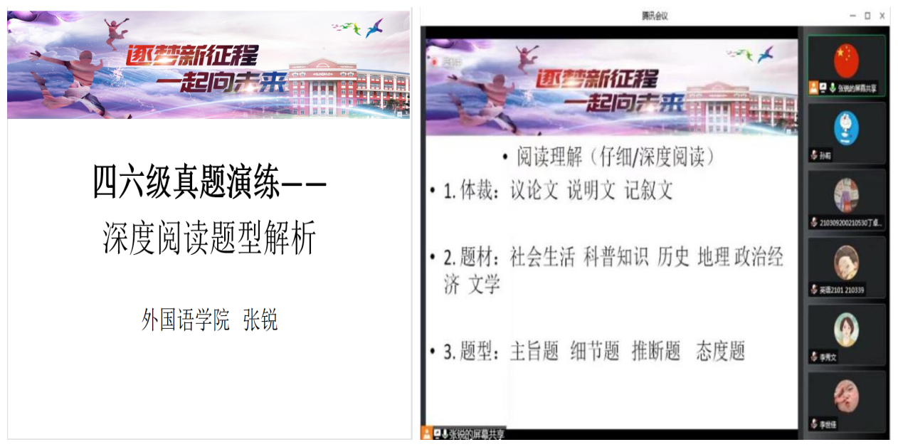 同时,beat365唯一官网部分青年教师也对讲座进行了观摩学习,促进了业务交流和教学反思。公共外语教学部赵雪老师表示,本次系列讲座不仅是特殊时期备考学生的“定心丸”,也为青年教师提供了精品课观摩和向“大咖”们取经的机会。像学生一样听课,除了获得教法的点拨,更深刻体会到了前辈们对教学的深耕和分享的热忱。作为青年教师更要精进业务,提升教学本领,服务人才培养和战“疫”大局。公共外语教学部班明霞老师表示,作为一名青年教师,切身感到此次系列讲座内容实用性佳、针对性强、涵盖面广,有效地助力了全校学生缓解学习压力、提高学习质效、提升大学英语四六级成绩,自身也受益匪浅。要主动参与疫情特殊时期的教育教学工作,坚决保证教学质量和效果,与校、院和广大同学同心战“疫”。