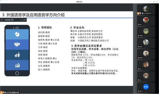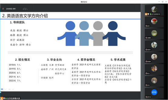 随后,她向同学们介绍了学院概况、英语专业的发展历程和取得的成果。全面地介绍了这两个方向的导师团队、近年的招生情况、毕业去向、奖学金评定规则,并讲解了个人培养计划,让同学们明晰培养目标和课程安排。在师生互动环节,详细解答了同学们的疑问,拉近了师生之间的距离。