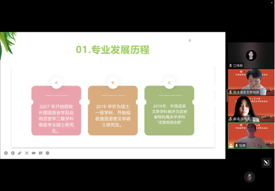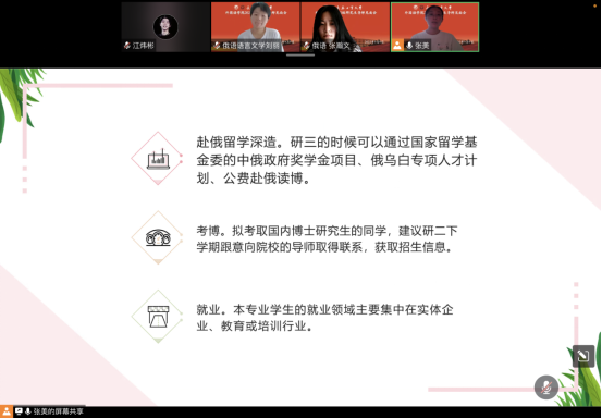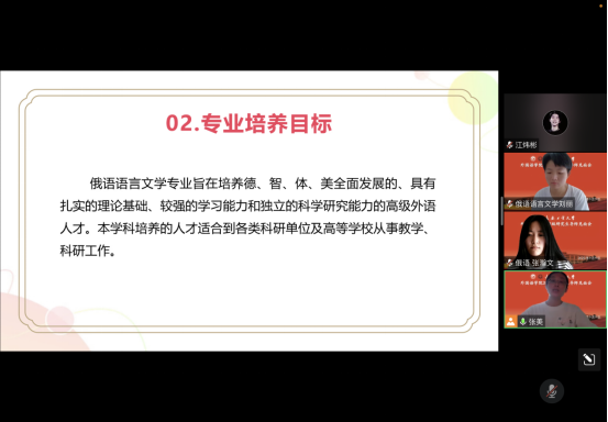 俄语系主任张美为俄语语言文学专业的2022级硕士研究生进行入学教育。张美首先介绍了beat365唯一官网和俄语语言文学专业的发展历程,全面地讲解了专业人才培养目标和培养过程、课程学习方式、毕业论文的撰写和学术要求。然后分析了毕业生的就业现状,对毕业后是继续深造还是就业等问题进行了解答,并叮嘱同学们要明确自己的学习目标,做好生涯规划。最后,她与2022级新生就如何更好地学习、找到感兴趣的研究方向,进行了交流讨论。