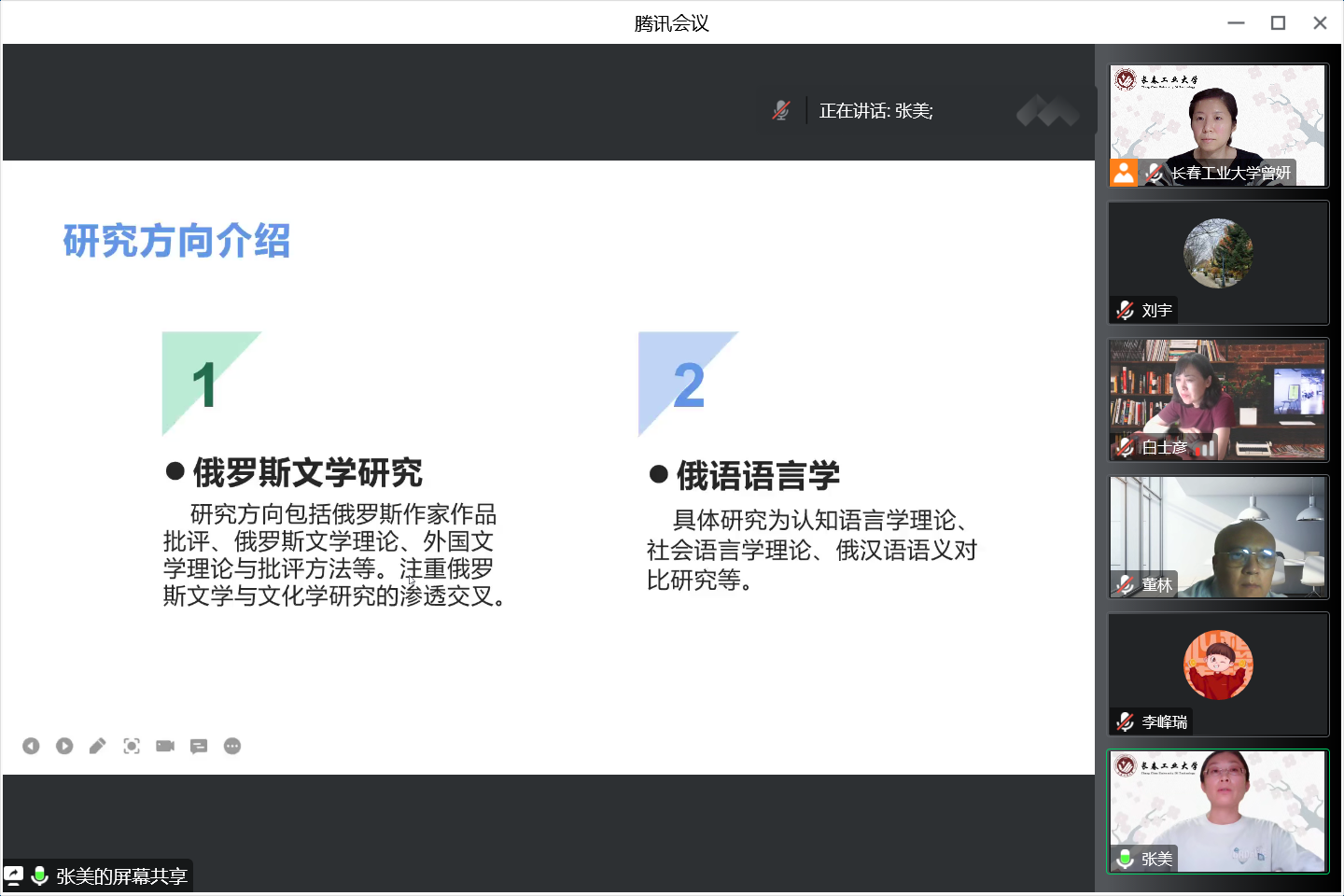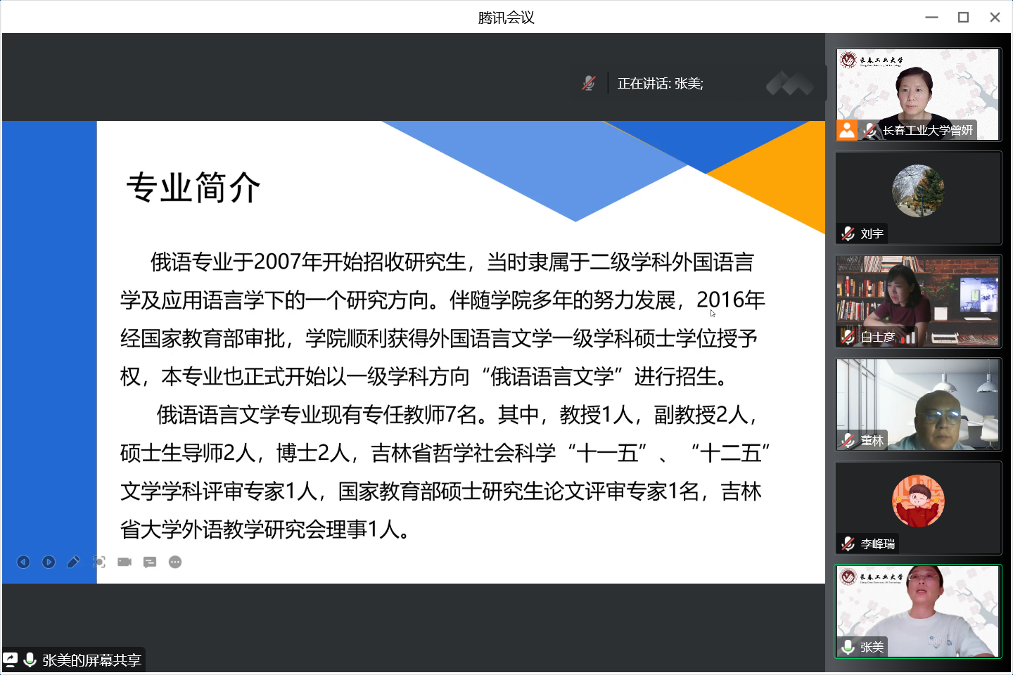 随后,张美进行了俄语语言文学方向的说明。主要从专业介绍、招生指南、题型介绍三个方面对俄语语言文学方向的发展历史、导师团队、课程体系、研究方向、就业前景、赴俄留学项目、招生计划、题型设置等相关问题进行了详细地介绍,在过程中强调了读研对于人生的意义以及报考长春工业大学研究生的优势。她希望各位考生基于自身情况有针对性地制定复习方案,注重专业基础语言能力和语言素养地提升。