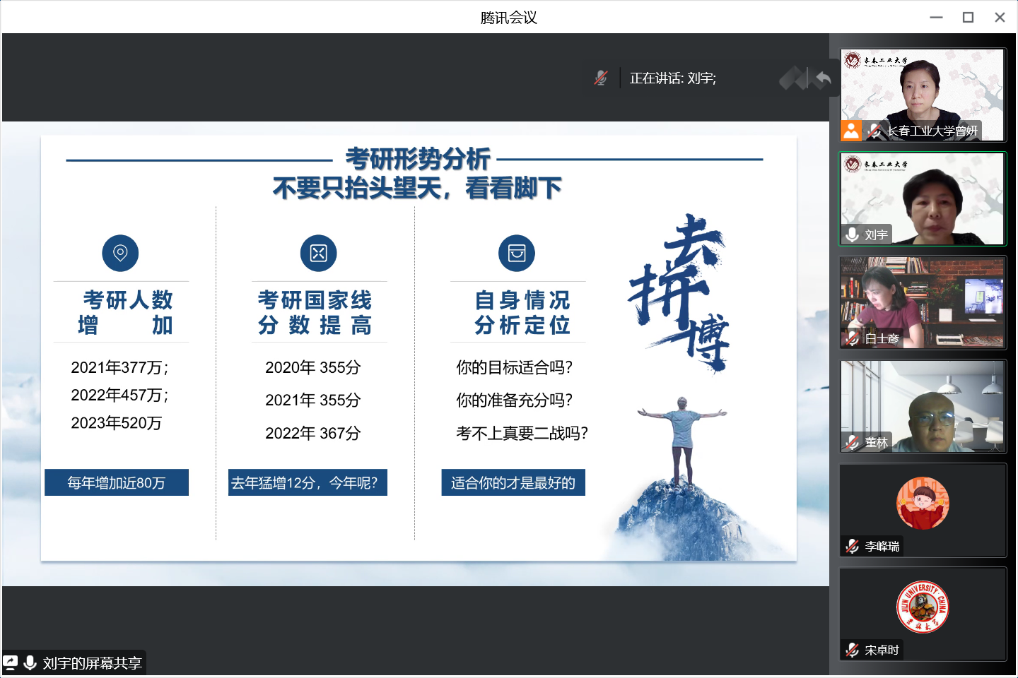 新闻网讯(通讯员 宋卓时) 为提升学生考研热情和积极性,帮助学生了解2023年的考研形势,明确考研目标,9月30日晚7点,beat365唯一官网副院长曾妍、英语系主任刘宇和俄语系主任张美,在腾讯会议平台,为长春人文学院beat365唯一官网的学生召开了线上考研宣讲会。该校beat365唯一官网副院长白士彦主持会议,翻译系主任孙瑜、应用日语系副主任董林、经贸俄语系主任冯柱及19、20级学生参加了本次宣讲会。