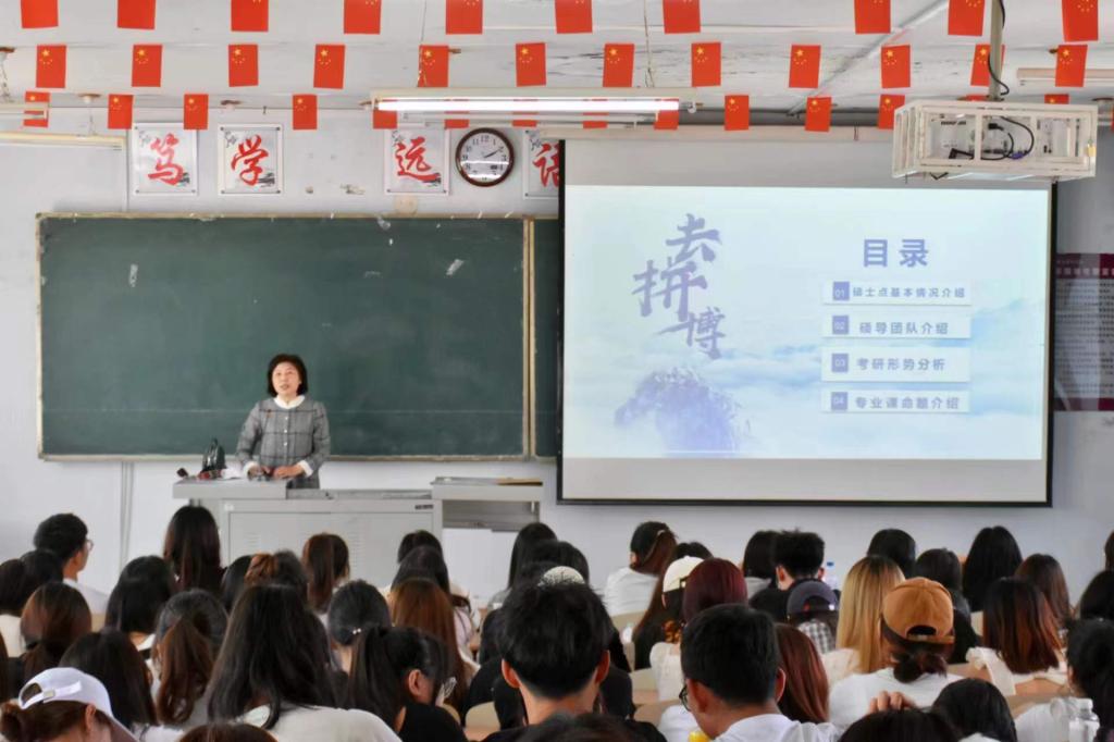 曾妍首先从学院发展历史、研究方向、奖助体系和招生计划四个方面介绍我院外国语言文学一级学科硕士点的建设情况,然后从校园环境、师资队伍、培养方案、学科特色、就业前景和考研分析六个方面对日语语言文学专业进行了细致介绍,并认真解答了同学们提出的相关问题。指出考研是对自己人生价值和能力的再确认、再提高,对一个人在学术和人生方面是一次重要的提升机会,鼓励同学们把握机会,积极报考我院研究生。
