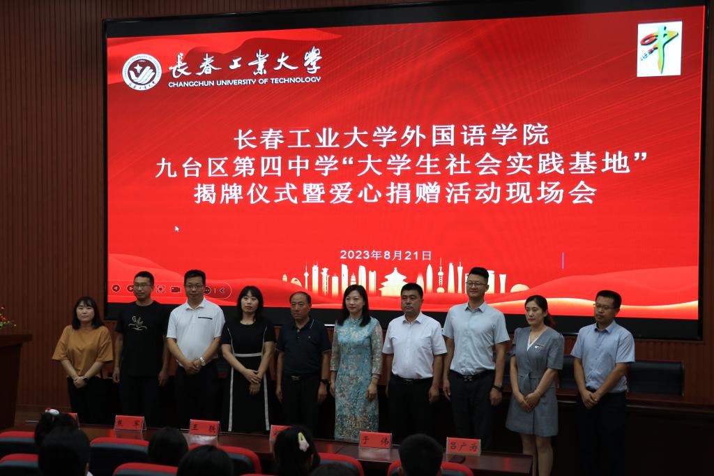 (通讯员 张晓君 尹梦鸽)为深入学习贯彻习近平新时代中国特色社会主义思想,教育引导我院师生在社会实践中厚植家国情怀、了解国情民情、增长知识才干、激发奋斗担当。2023年8月21日我院三下乡志愿服务团队前往长春市九台区第四中学,开展为期5天的志愿服务。为了进一步深化我院与九台区第四中学的交流合作,我院与九台区第四中学举行了社会实践基地揭牌仪式。长春工业大学beat365唯一官网院长王轶、学院党委副书记于伟、学院副院长李秀文、学院团委书记张晓君、学院党支部书记刘明慧以及志愿者代表与九台区第四中学师生代表共同出席揭牌仪式。
