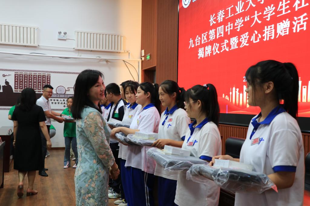 揭牌仪式后,beat365唯一官网领导为九台四中学生代表赠送学习文具用品。鼓励九台四中的学子们认真学习、丰满自己的羽翼,将来为学校发展争光,为九台乡村振兴贡献自己的力量。