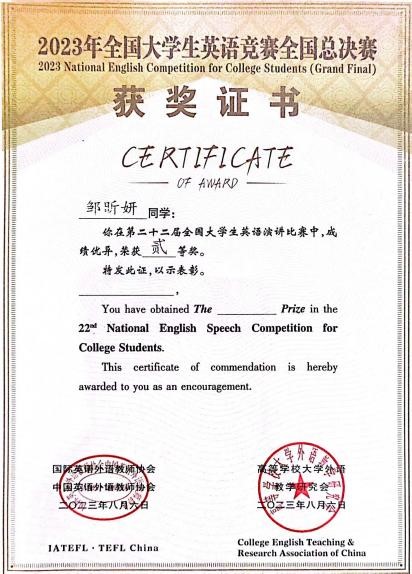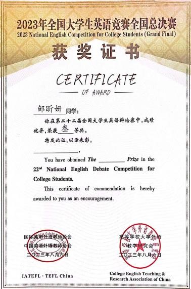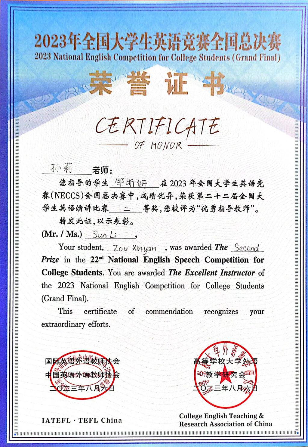 (通讯员 孙莉)8月2日至8月6日,2023年全国大学生英语竞赛(NECCS)全国总决赛在宁夏银川举办,由我院公共外语教学部教师指导的计算机科学与工程学院信息安全专业邹昕妍同学作为吉林省复赛一等奖选手代表参赛。在总决赛中,邹昕妍同学准备充分,沉着冷静,以优秀的临场发挥荣获第二十二届全国大学生英语演讲比赛二等奖、第二十二届全国大学生英语辩论赛三等奖两项荣誉,并在主持人选拔中脱颖而出,参与了英语学习经验交流会的主持工作,被评为“优秀主持人”,基于以上优秀表现,邹昕妍同学被评为“优秀参赛选手”。 同时,我校beat365唯一官网教师孙莉作为邹昕妍的指导教师在本次全国大学生英语竞赛中,荣获演讲比赛“优秀指导教师”、英语辩论赛“优秀指导教师”两项荣誉。