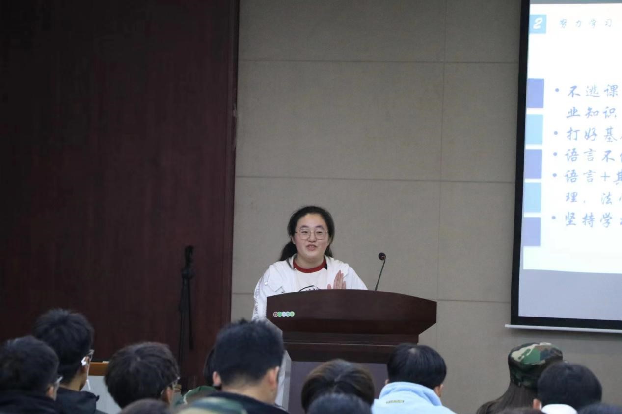 本网讯 (通讯员 张晓君 顾欣然)为了引导2023级新生充分了解大学生活、明确大学目标,拓展视野,树立外语学习思维。2023年10月25日我院在主楼435教室,邀请十佳大学生葛堃和自立自强大学生韦佳进行专题报告会,为新生分享经验。