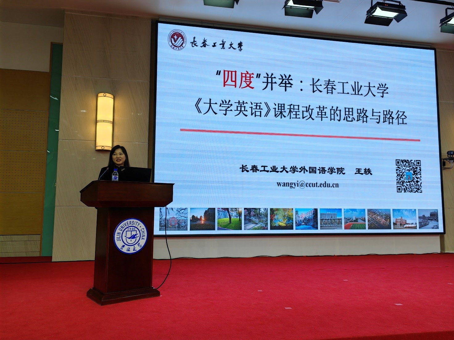 本网讯(通讯员 佐冰冰)2023年11月25日,“吉林省大学英语教学改革与发展研讨会暨2023吉林省本科高等学校公共英语类专业教指委年会”在吉林大学胜利召开。本次研讨会由吉林省教育厅高等教育处指导、吉林省本科高等学校公共英语类专业教学指导委员会主办,吉林大学、华语教学出版社承办。会议邀请了国内知名专家、省内大学英语教学教师负责人和教师代表参加了此次研讨会,我院院长王轶教授和公共外语教学部佐冰冰、姜力、刘欣欣等老师出席会议。