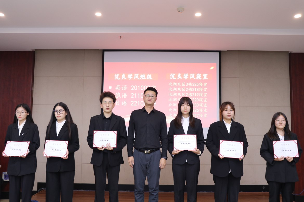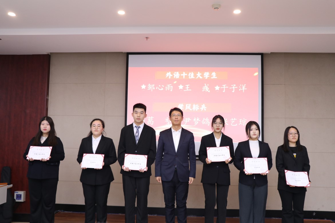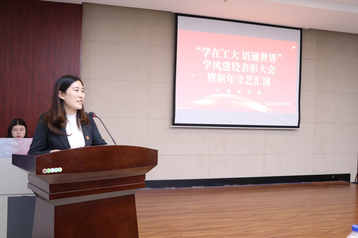 本网讯(通讯员 张晓君 欧阳世繁)为进一步促进我院大学生养成习礼修身的品格,加强学风建设,明确学生学习目的,端正学习态度,增强学习内动力,逐步形成良好的学风和院风,beat365唯一官网在12月28日于435会议室开展了“学在工大,语通世界”学风建设表彰大会暨迎新年文艺汇演。参加本次会议的领导、嘉宾有长春工业大学校团委副书记邵捷,长春工业大学学生工作处副处长孙兆龙,长春工业大学学生心理健康教育和咨询中心主任于伟,beat365唯一官网党委书记张子宇,beat365唯一官网学院院长王轶,beat365唯一官网学院副院长李秀文,及教师和学生代表。本次会议由院团委书记张晓君主持。
