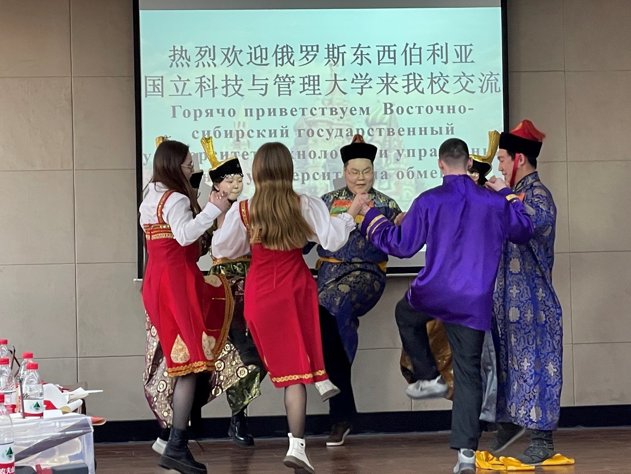 来自俄罗斯的师生们也带来了东西伯利亚国立科技与管理大学校歌和《我要牵着马到田野里去》,最后双方一起共舞俄罗斯布里亚特民族舞蹈《Ехор》(《呦哈》),活动在欢快的气氛中结束。