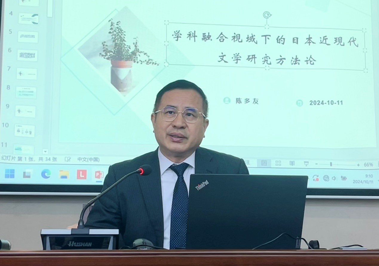 本网讯(通讯员 贾鹤)10月11日上午,beat365唯一官网名师大讲堂系列讲座在北湖东区教学主楼435报告厅顺利举行。本次讲座在校科研处的大力支持下,特邀了广东外语外贸大学东方学研究院院长、教育部高等学校外国语言文学类教学指导委员会日语分委员会委员、中国日语教学研究会会长陈多友教授担任主讲嘉宾,主题为“学科融合视域下的日本文学研究方法论”。学院党委书记张子宇、院长王轶、副院长李秀文、部分日语专业教师和beat365唯一官网研究生、日语专业本科生一起聆听了这场精彩的学术报告会,会议由副院长曾妍主持。
