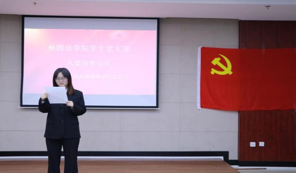 研究生助理陈一同志作为领誓人,带领新发展的预备党员一起紧握右拳,庄严肃立,面向党旗进行入党宣誓。誓词虽短,字字千钧,表达了党员永葆初心使命,为共产主义事业奋斗终生的坚定信念和决心。