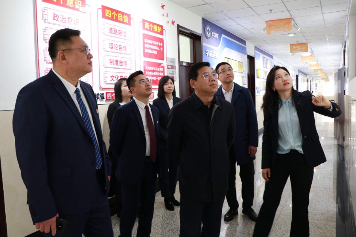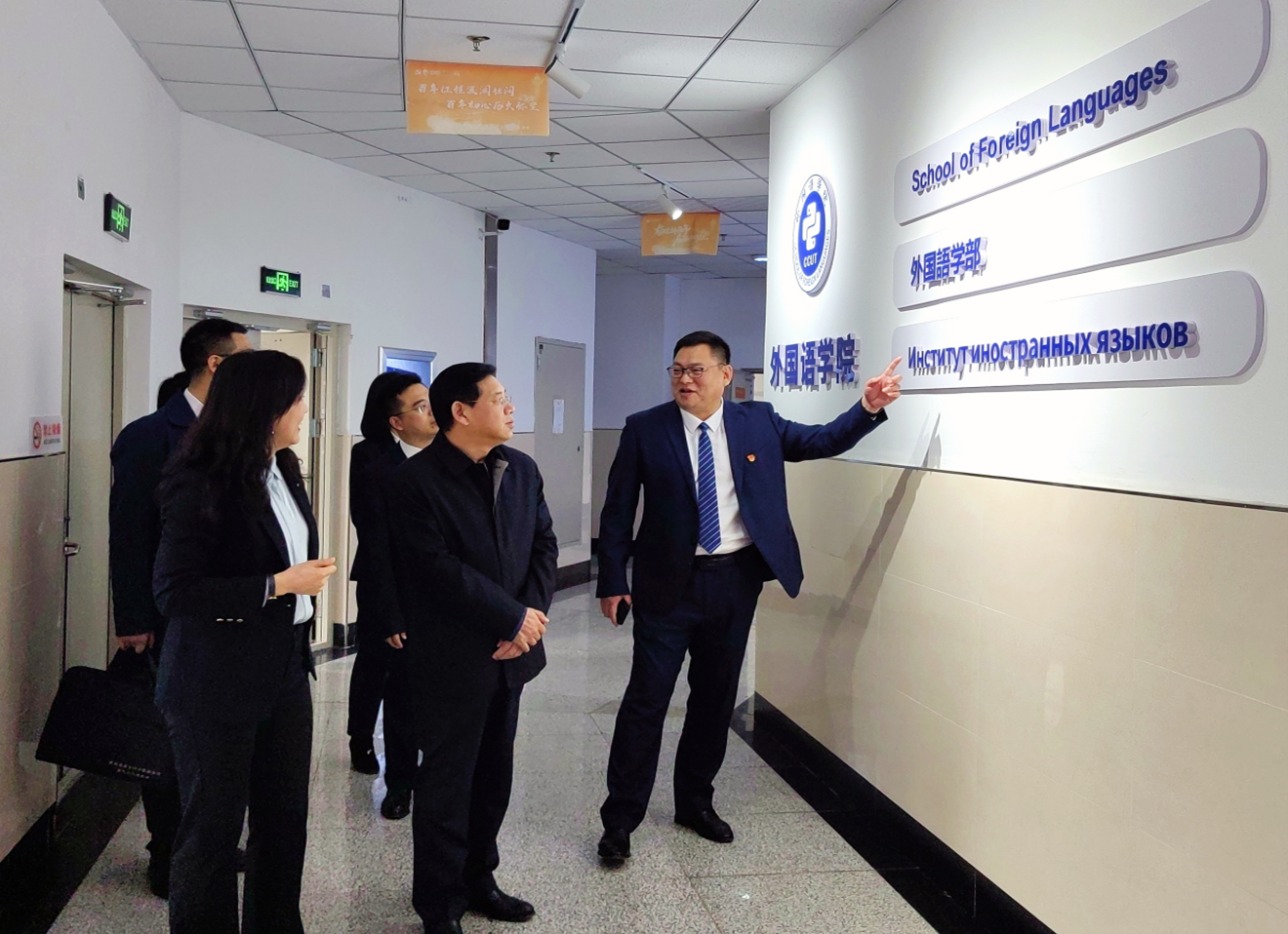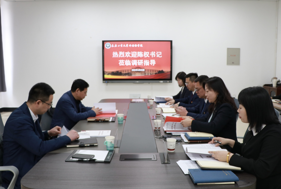 陈权在学院班子成员陪同下,实地调研了学院网络数字语言实验室、同传实验室、电台室的建设和运行以及系部设置等情况,参观了学院廊道文化,深入了解学院发展历程、师资风采及办学成果等情况,对学院在推动学校改革发展中发挥的积极作用给予充分肯定。