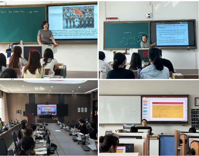 教师们围绕“纪念中国人民抗日战争暨世界反法西斯战争胜利80周年”主题,运用英语、日语、俄语等多语种史料,对比分析了不同文化背景下的战争记忆与历史书写。课堂上,师生共同研读抗战时期的国际报道,翻译抗战文学作品,深入探讨了语言背后蕴含的意识形态与历史观差异。