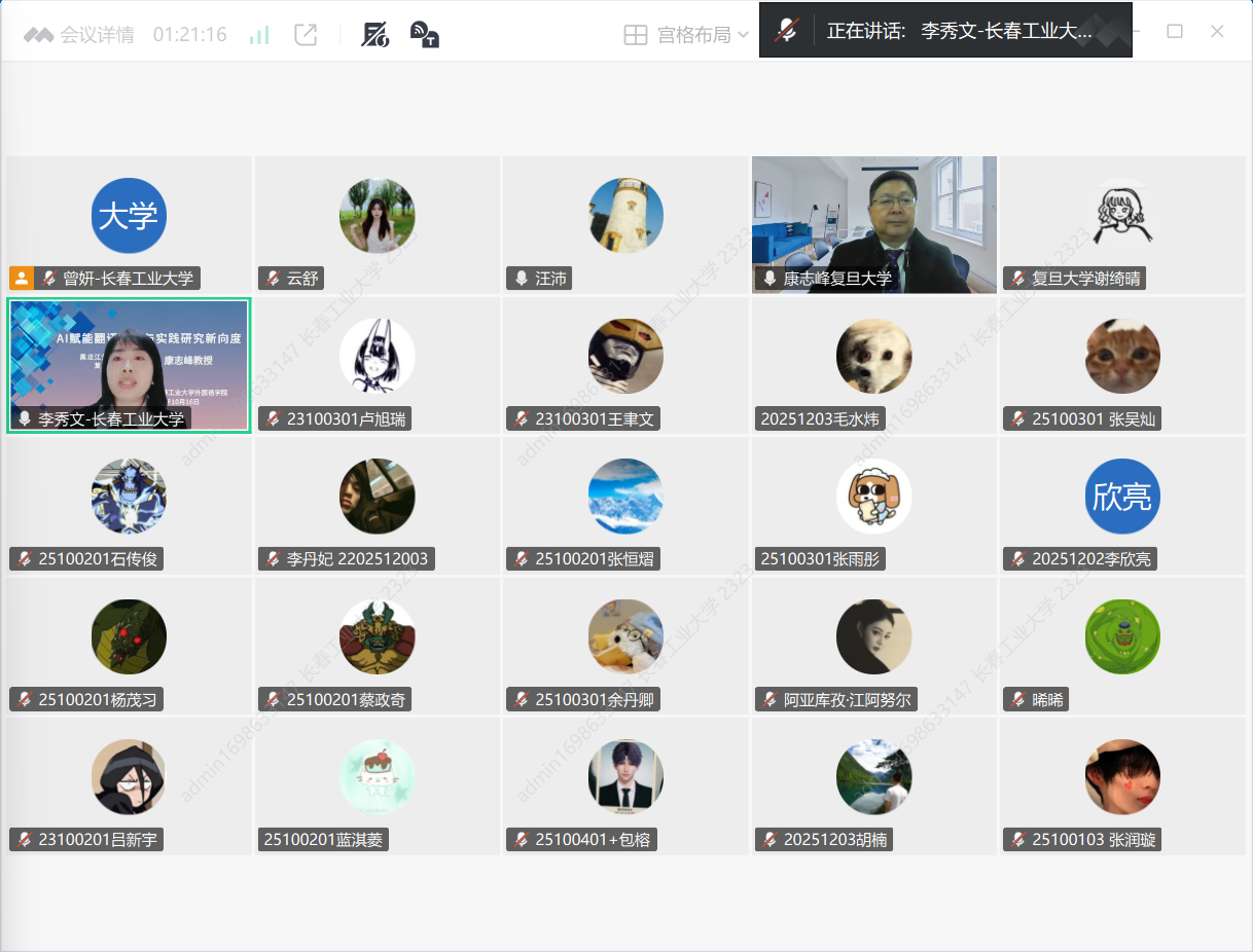 康志峰教授围绕“AI的迅猛发展为翻译领域带来了革命性变革,催生了理论与实践研究的新向度”这一主题 ,从AI+大翻(口)译、体认口译学溯源、体认口译学定义、论要解析1-4、视译眼动实验(福州大学)、带稿同传眼动实验(复旦大学)等六个方面,具体阐述了AI赋能下翻译研究范式如何进行转型,并鼓励在场师生思考:AI赋能下翻译研究在理论和实践层面如何进行创新?康教授强调:“未来的翻译研究应聚焦于人机智能的深度融合,探索构建新型翻译批评标准与人才培养体系,以应对数智时代的新挑战与新机遇。”
