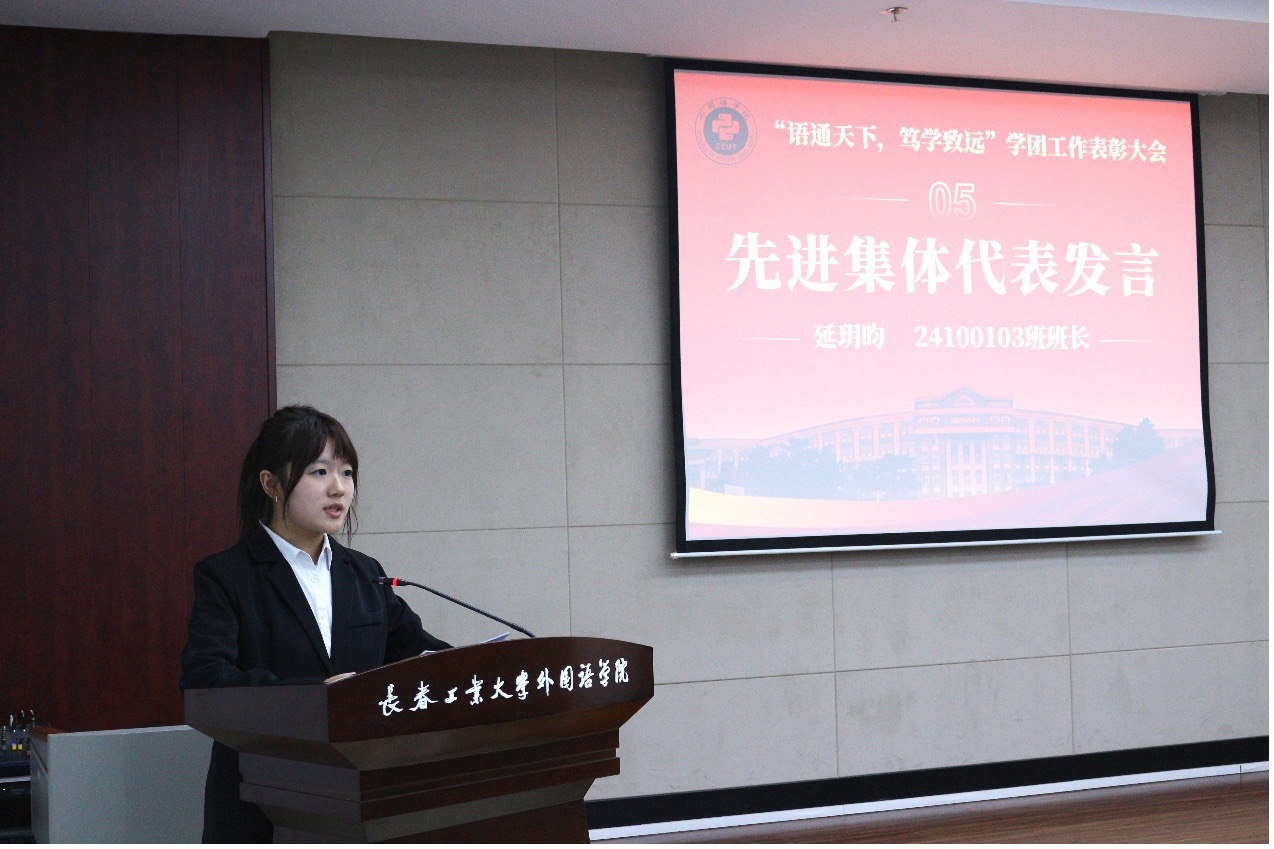 先进集体代表24100103班班长延玥昀在发言中介绍,在学院领导老师的指导帮助与言传身教下,班级于2024-2025学年实现了“零挂科、零违纪”和大学英语四级过级率100%的双重突破,在多门考试科目以“无人监考”的模式进行,并在学科竞赛和文体活动中取得了很多成绩。她代表班级承诺,将持续弘扬“勤学、善思、笃行、共进”的班风,努力学习,坚守诚信准则,全力延续“零挂科”记录和“无人监考”的考试模式,争创专四过级率100%、专八过级率再创新高,努力建设成为堪当民族复兴重任的新时代青年集体。