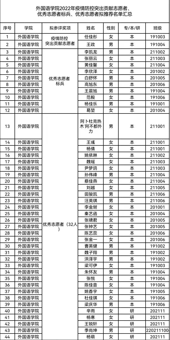 为大力弘扬“奉献、友爱、互助、进步”的志愿精神,鼓励引导全校学生积极参与志愿服务,在急难险重任务中担当作为。我校决定开展2022年疫情防控突出贡献志愿者、优秀志愿标兵、优秀志愿者的公示的评选工作。按照学校团委的志愿者评选标准,我院拟推荐2位疫情防控突出贡献志愿者、10位优秀志愿标兵、32位优秀志愿者。