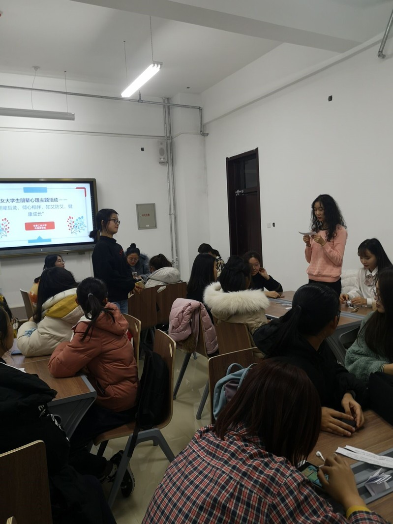 活动的第二个环节女大学生心理问题与压力讨论分享中,大一大二的同学共同组成小组合作讨论对活动之前从各班同学中征集到的感到困惑或者心理压力的情境的理解及应对方式,并在讨论结束后进行分享。学校心理站的赵君老师也对同学们的讨论分享进行了热心的指导,并分享了很多经验与建议,让同学们获益匪浅。