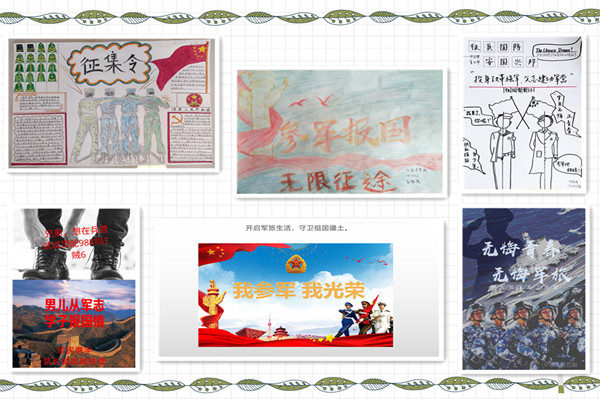 同时各班召开了主题班会,同学们纷纷发表了自己对参军的看法。还通过画笔表达对军营生活的向往,通过口号和海报表达参军的热情。