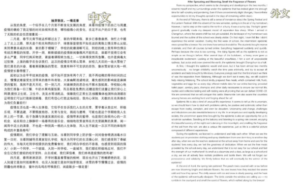此次双语主题征文活动,大家用手中的笔和铿锵有力的声音记录了这场抗议阻击战中值得铭记的时刻,一起为这场生命健康保卫战助力。通过优美的双语表达,展现了我院学生们的积极风貌和语言风采,推动了我院疫情期间的文化建设。