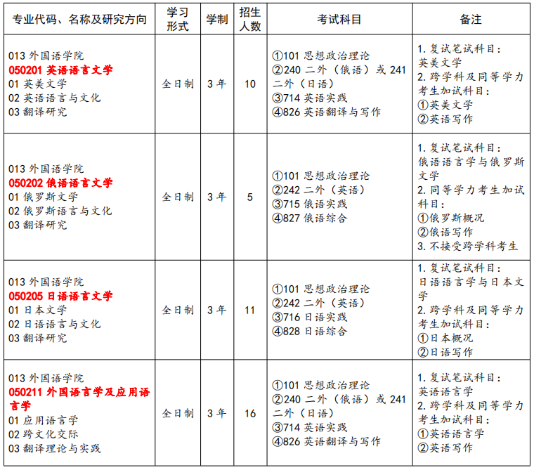 外国语言文学学位点经过长期的学科建设与发展,已经形成了英语语言文学、日语语言文学、俄语语言文学和外国语言学及应用语言学4个稳定并具有一定特色的学科研究方向。
